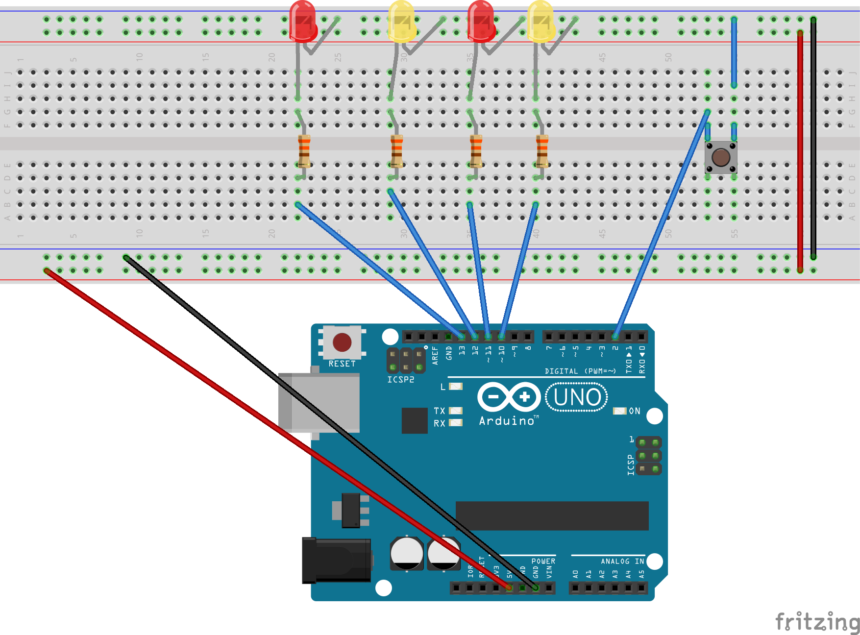 In the first example we use the button without the interrupt attached on on pin 2 and use the conventional way to look at inputs. When pressing the button you will experience delays in execution and it will seem the button is not functional. You will notice that I don't use a pull up resistor on the button. We use the internal pull up resister on pin 2 with by using this code: