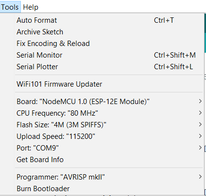 We start by selecting the NodeMCU 1.0 (ESP-12 Module) under the board options in the Tools menu (See Image for the complete configuration). See Image ? . The only thing that could be different on your computer is the COM port. You just need to select the COM port available to you under the Tools menu Port option.