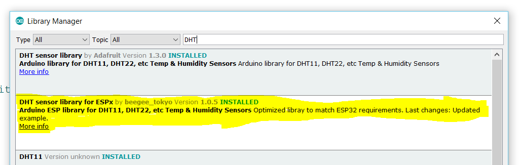 You can find the Library Manager under the Sketch menu and selecting the Include Libraries, and then the Manage Libraries option. In the search bar type dht to only show the libraries related to the DHT11/22 sensor. Click the more info link on the DHT library for the ESPx. A dropdown will appear where you select the latest version of the driver, then click the install button.