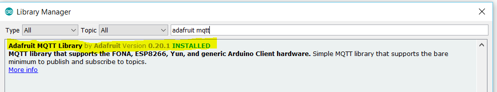 There are two ways of getting the libraries needed. The first one is by downloading them from github by clicking on this link: https://github.com/adafruit/Adafruit_MQTT_Library. The second one is using the Arduino IDE library manager the same way as you installed the library for the DHT 11/22 sensor. The only difference is that you type in "adafruit mqtt" in the search bar. I installed version 0.20.1 of this library.