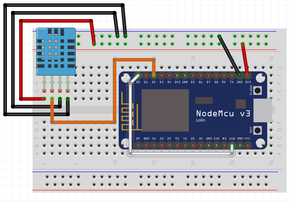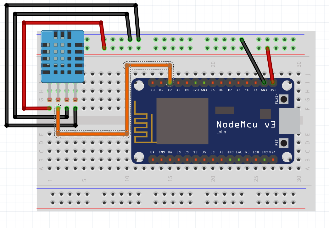 I selected this library as it takes in consideration the slow communication speed of the DHT11/22 when running on 3.3v. Next we connect the sensor as follows (with the grid facing you)