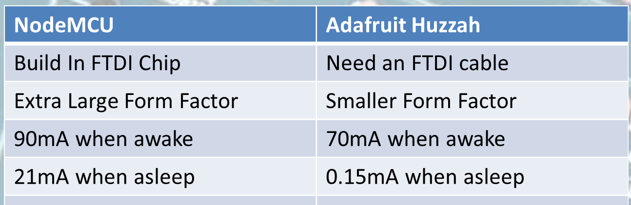 I wanted to quickly compare the NodeMCU with the Adafruit Huzzah. If you are going to connect your project to a power supply the NodeMCU is a good solution as you don't have to buy special cables, you could even power it with a USB charger/cable.